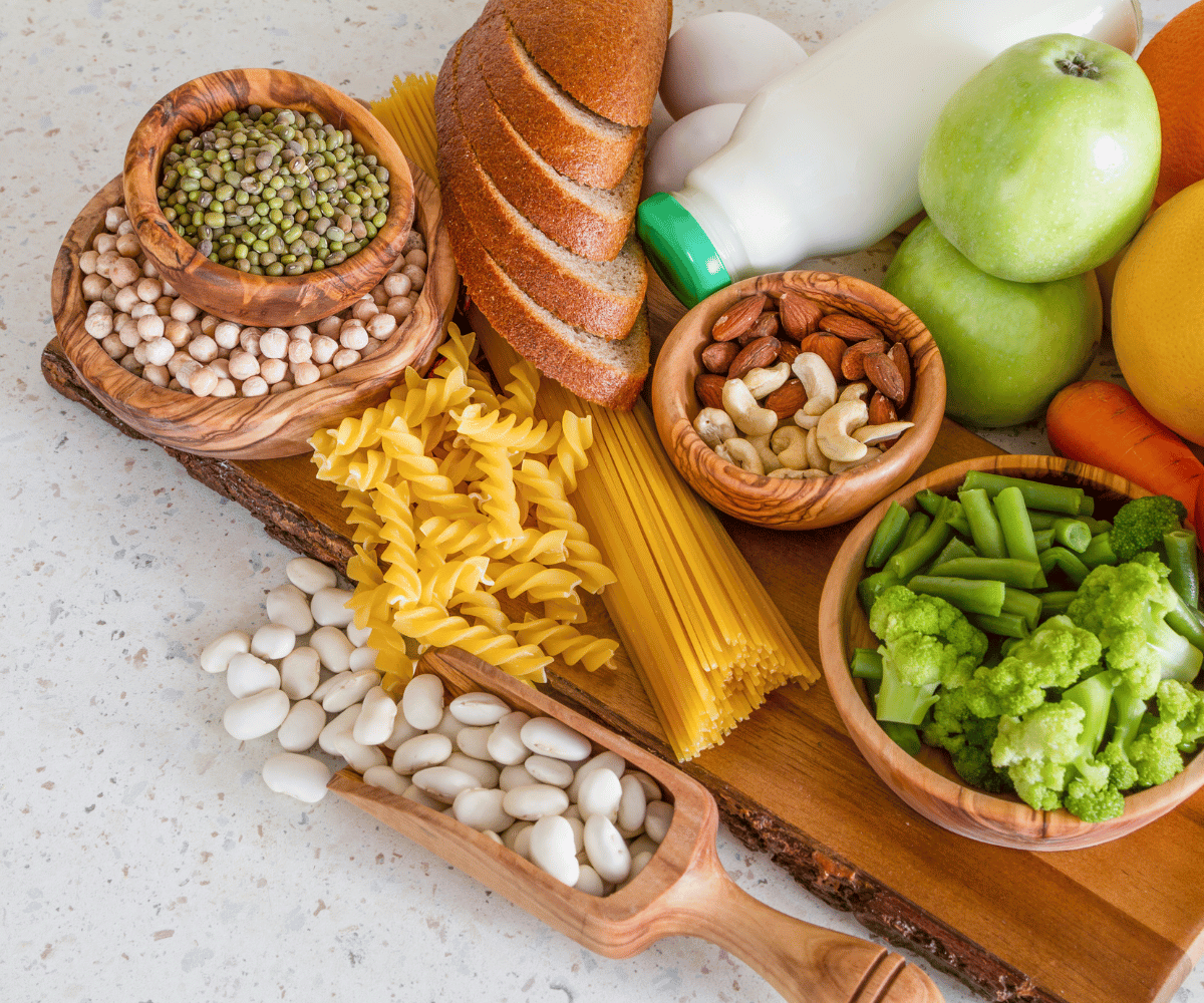 λαχανικά, δημητριακά ολικής αλέσεως, πρωτεΐνες και ελαιόλαδο.